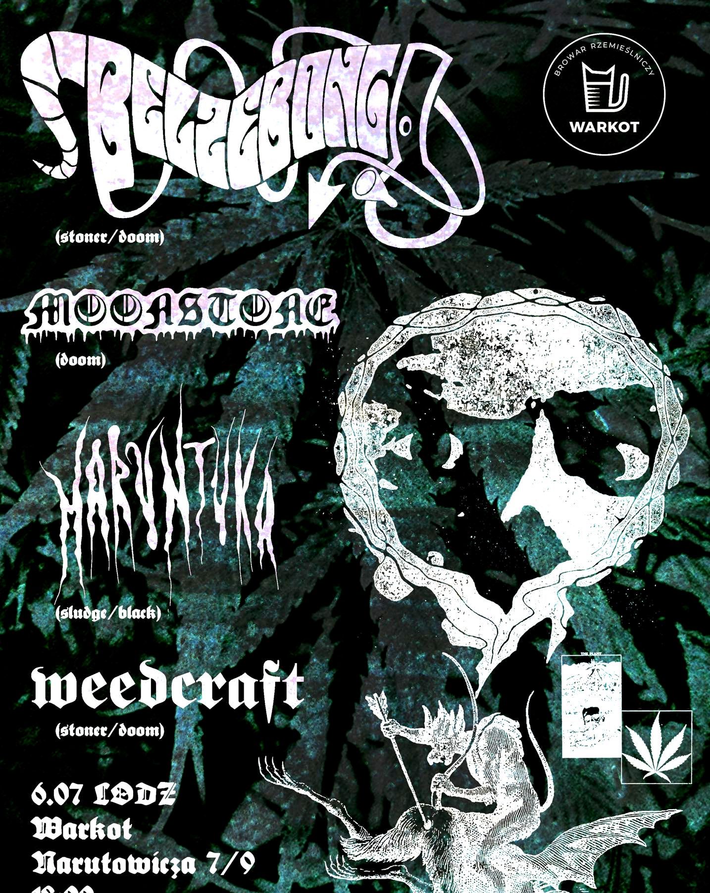 Jaki Belzebong, taki cały rok! Tego wieczoru ludzkie płuca zawstydzą łódzkie kominy, a Zielone Świątki poprowadzą: BELZEBONG / zioło https://www.facebook.com/belzebong420 Czy komukolwiek trzeba przedstawiać legendę weed metalu? MOONSTONE / palto https://www.facebook.com/moonstone.doom Moonstone to przytłaczające riffy, rozsadzający trzewia bas i rytmy, które przekraczają skalę Richtera. To wybuchowa mieszanka przestrzeni oraz ciężaru, która gwarantuje soniczny trans o orbitalnej skali. Krakowski kwartet szlachetnie wykorzystując brud dźwiękami opisuje otaczający nas świat. MARUNTUKA / skun https://www.facebook.com/maruntuka666 Maruntuka to taki trochę bękart Yoba i Eldera, porzucony i wychowany przez Mgłę. Bleki, sladże, łamańce, śluz i melodyjki, a na żywo spastyczny wpierdol. Wydali niedawno debiut o tytule "Ooz", który zabierze Ciebie, drogi słuchaczu, w mroczną podróż do bagnistej krainy. I pamiętaj, że na nadzieję jest już za późno... WEEDCRAFT / sztynks https://www.facebook.com/weedcraftofficial Puławska grupa na stołecznej emigracji. Gęsty bulion z tłustych riffów szczodrze zakwaszany chwytliwymi melodiami. Czas wolno płynie, dobrze się żyje, człowiek jeść musi. Tłuste. Bilety: 80 PRESALE (już wkrótce) / 110 w dniu koncertu JARAJ ALBO GIŃ