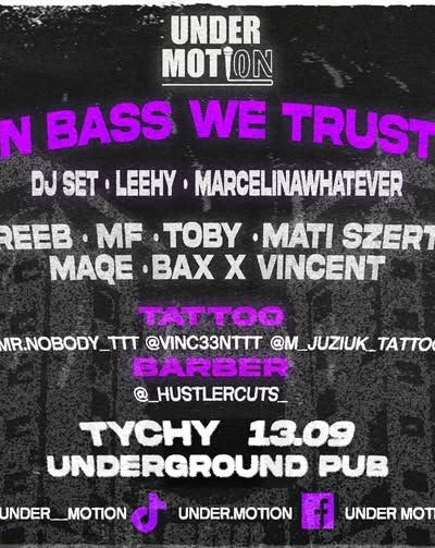 IN BASS WE TRUST to pierwsze wydarzenie z cyklu trapowych imprez organizowanych przez UNDER MOTION w Tychach. Projekt powstał z myślą o połączeniu miłośników podziemnego rapu i trapu w wyjątkowym, undergroundowym klimacie.